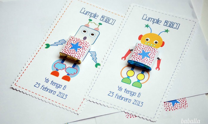 Es una idea muy sencilla en la que solo hace falta un poco de imaginación, papel, colores y chocolatinas con las que darle vida a cada uno de los robots. Y si quieres rematar la idea, puedes personalizar cada invitación para cada niño, haciendo robots parecidos a sus destinatarios, ¡los niños se quedarán con los ojos abiertos al verlas!