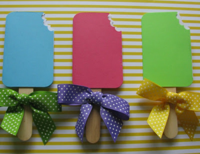 Para la elaboración de estas tarjetas solo necesitamos cartulinas, palos de “polos” y cintas para hacer lazos con los que decorarlos. Estas tarjetas tan monas se pueden hacer de distintos colores para simular varios sabores. Una vez las repartidas solo habrá que saborear la fiesta que hay preparada.