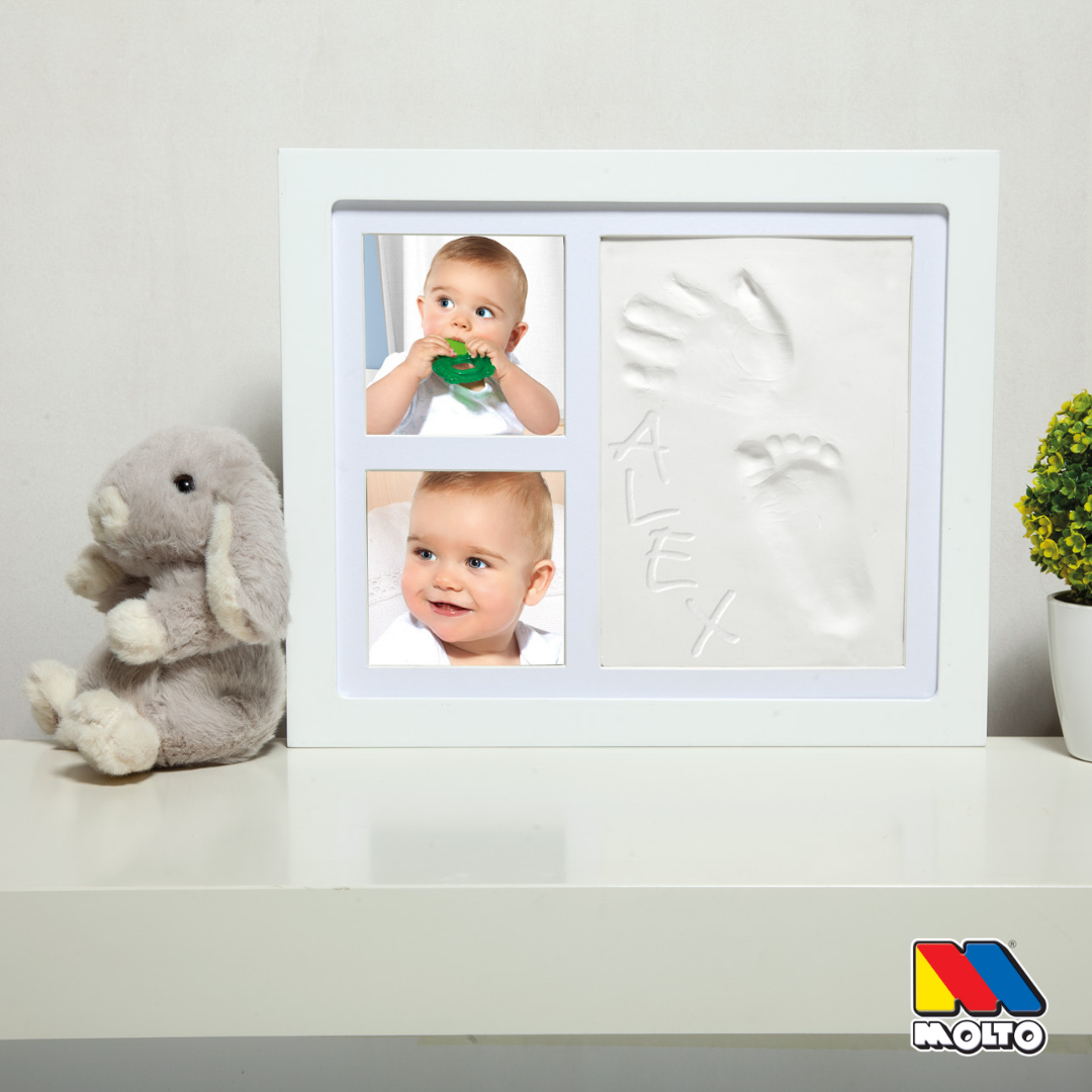 Además, con Magic Pic podrás conservar la huella de tu bebé tanto del pié como de la mano con una arcilla sin cocción 100% seguro para tu bebé. Dentro de las opciones que tenemos en Molto, puedes tener la pieza sola que se puede colgar, y la pieza con marco de fotos en tamaño pequeño y grande.