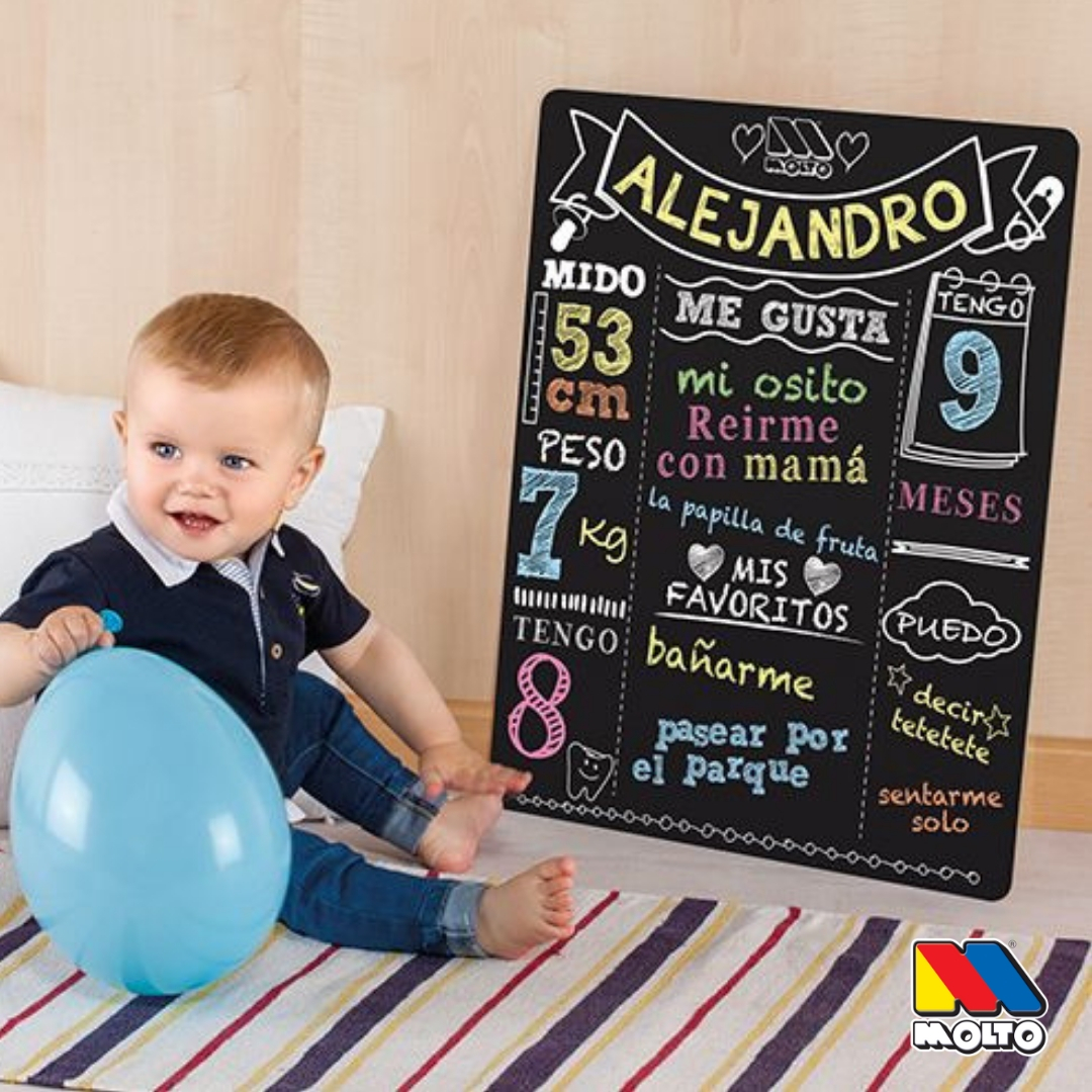 Otra opción, muy original, es la pizarra Mi bebé Crece, con ella podrás plasmar de una forma muy original todos los progresos del bebé e inmortalizarlos con divertidísimas fotos que te permitan conservar un gran recuerdo del crecimiento del bebé.
